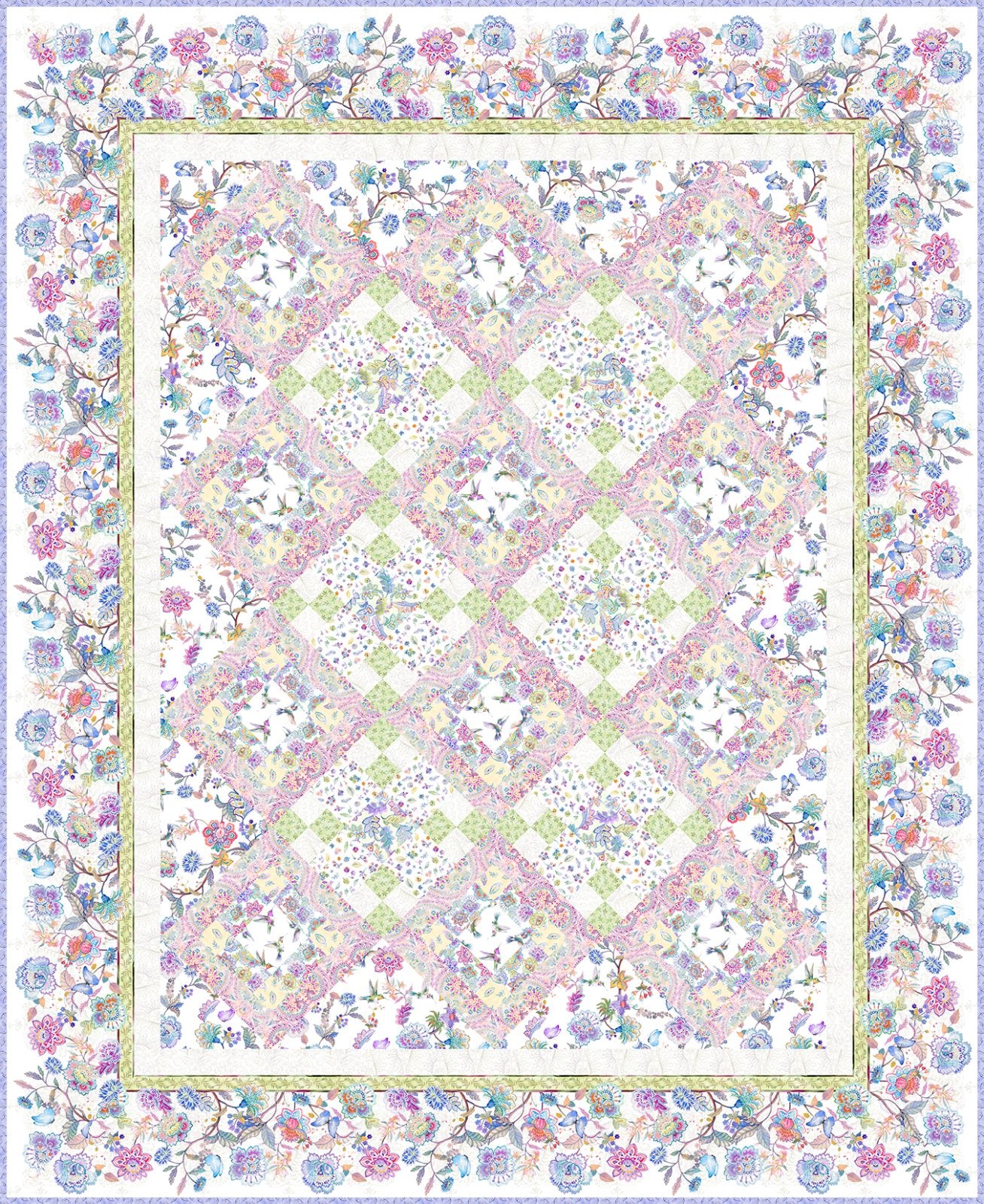 Bring the ethereal beauty of the Daydreams collection to life with this stunning quilt pattern from In the Beginning Fabrics. Featuring a delicate blend of watercolor florals, fluttering hummingbirds, and soft leafy prints, this quilt creates a dreamy, garden-like effect with its lattice-style layout and intricate border design. The pattern skillfully showcases the collection’s vibrant colors and elegant artwork, resulting in a finished quilt that feels both whimsical and refined.